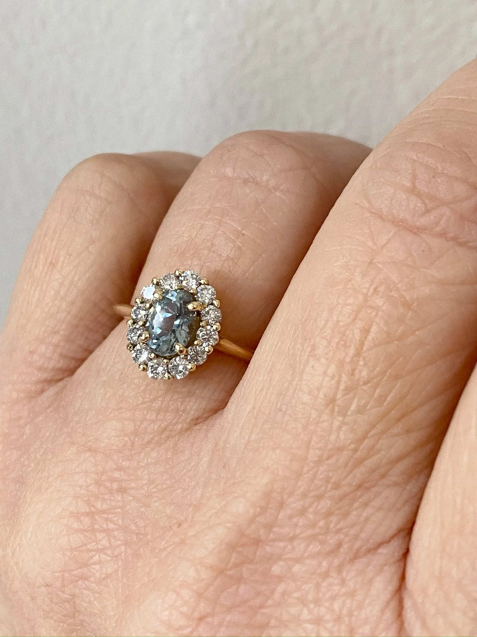 This timeless beauty features a blue-green spinel at centre stage with an elegant halo of Canadian diamonds. The setting sits low to the hand with a delicate and sturdy band of 14k recycled yellow gold. This twist on a classic is just perfection!