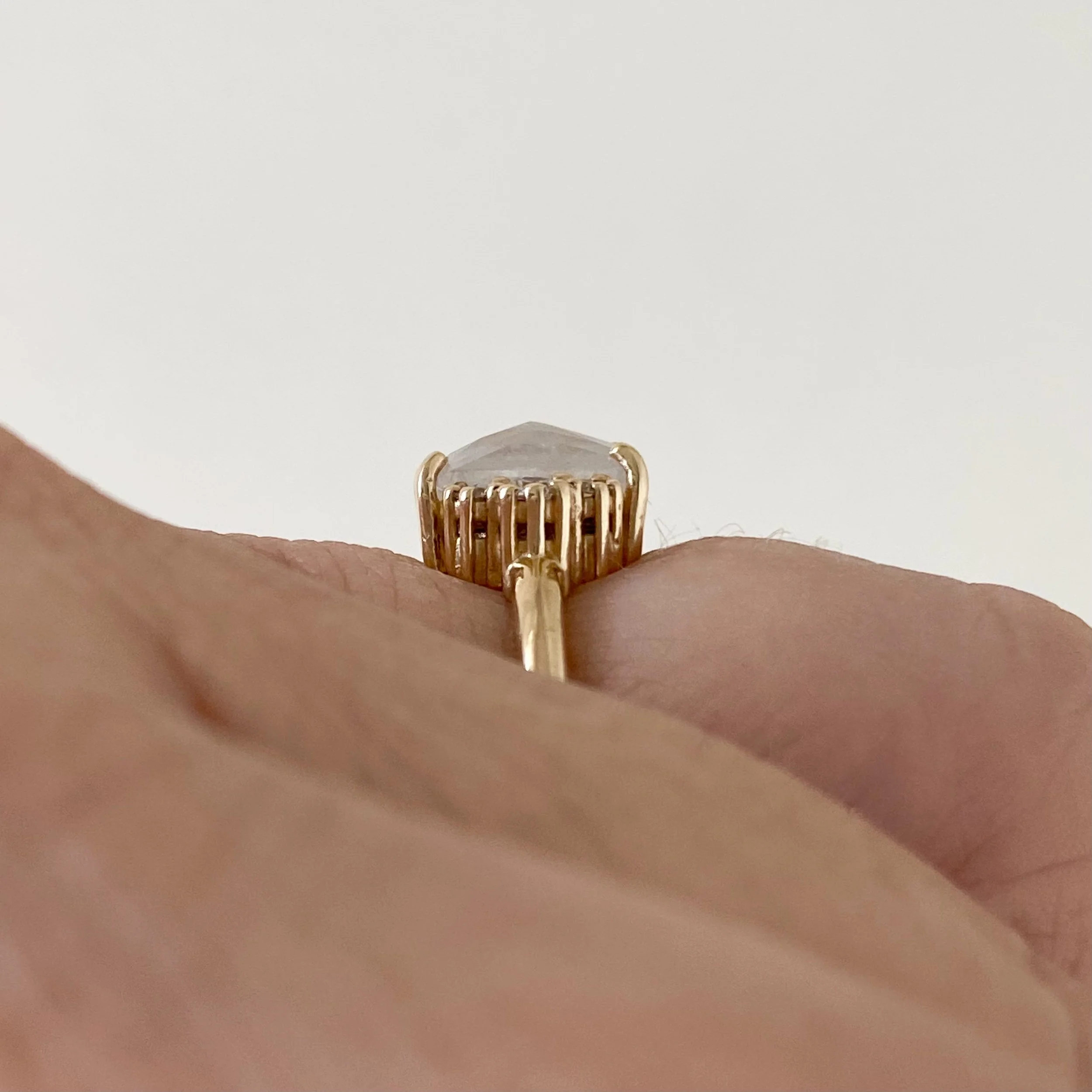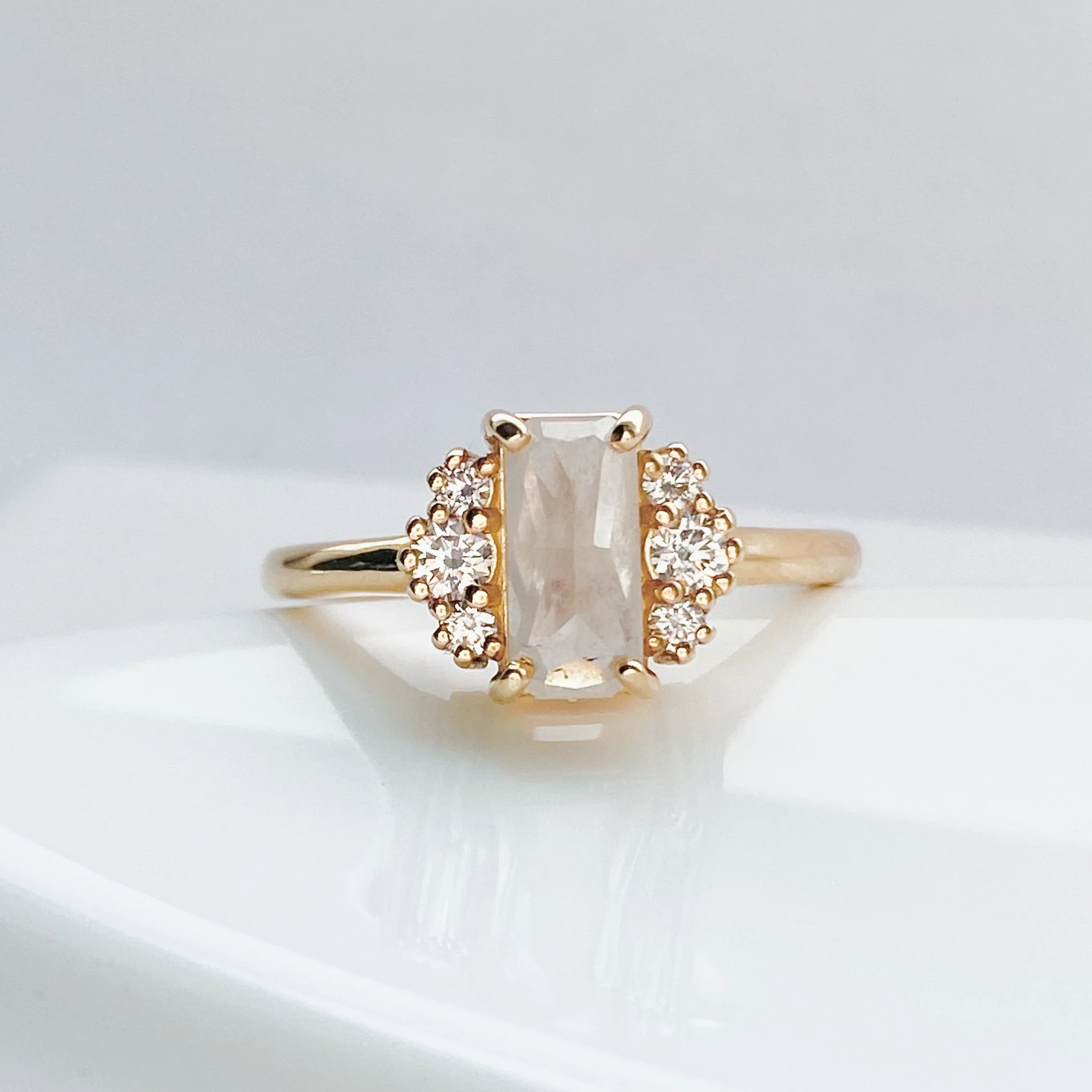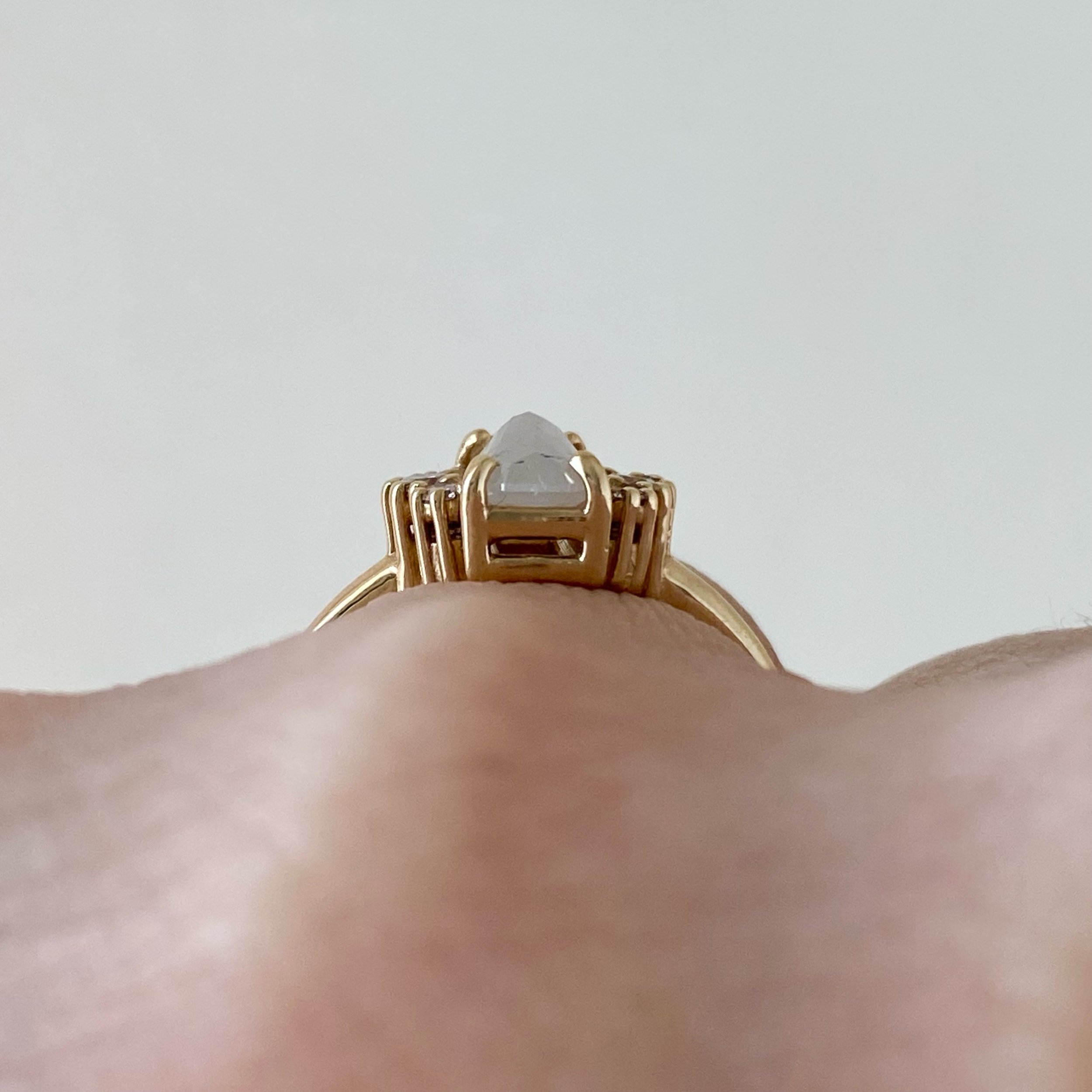This three-stone ring combines classic design with beautiful earthy tones. A natural light teal-grey sapphire creates a soft vintage feel, while yellow gold setting adds warmth and to the piece.